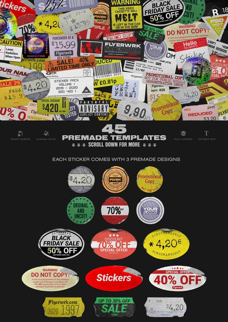 15 Peeled Paper Stickers + 3 Holo-Sticker Designs. A collection of 18 Layered Photoshop files, ranging from 3000-4000px in size. Each Sticker comes with 3 Premade designs. Made completely from scratch out of real photographs. Easy color Adjustment. Cropped by hand for authentic and unique edges.
