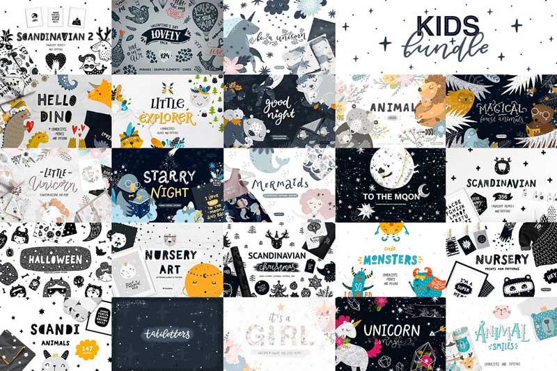 This kids bundle included 2850+ elements of a graphic from 22 different packs. Patterns, lettering, printable art, flowers, magical elements, and more kid’s goods!