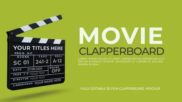 Bring cinematic flair to your next project with this Movie Film Clapperboard Mockup for After Effects. This stylish and realistic animation showcases a fully editable film clapperboard — perfect for intros, movie trailers, studio promos, YouTube openings, film festival teasers, or director reels.
