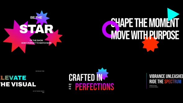 Featuring bold typography designs with bright gradient color combinations and graphic elements such as stars, circles, and abstract shapes that give a vibrant and futuristic look. Each title is equipped with smooth animations such as slides, pop-ups, and scale motions that make the text look more alive, help highlight the main message in the video, and give a more professional and engaging visual impression.